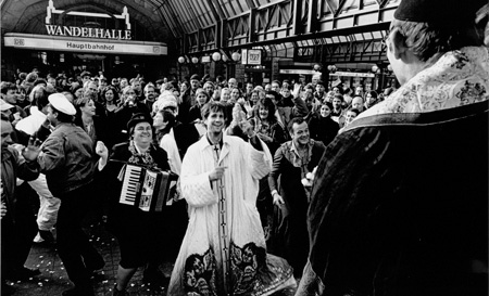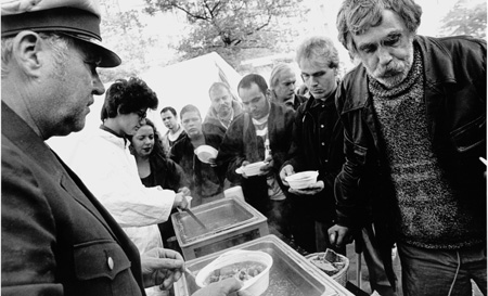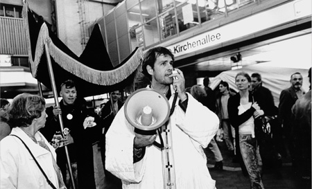 "Sieben Tage" harrte Schlingensief aus in seiner Bahnhofsmission in der Ex-Polizeiwache 11 in St. Georg, verteilte Suppe und bot ein Mikrophon. Er ging raus auf die Straße, in die Kirche, in die Peepshow, um mit jedem öffentlichen Auftritt mehr Beglückte und Verwirrte zurückzulassen.